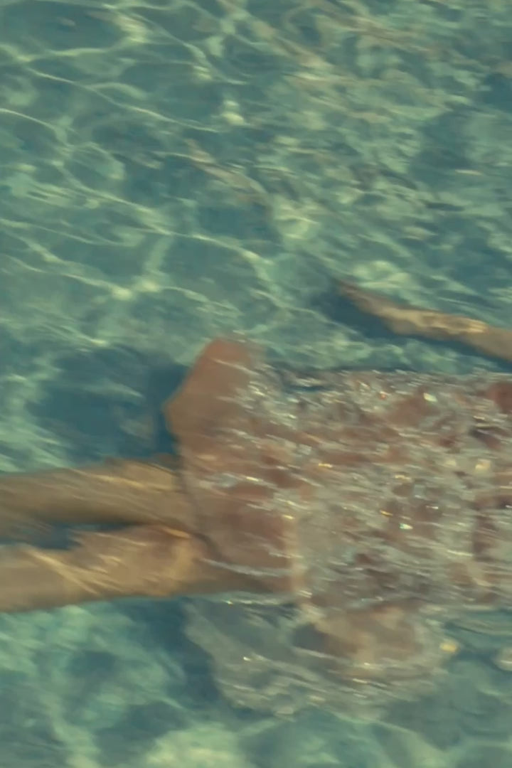 A gown entirely adorned with pearls, featuring a sensually open back. Optional Sea Bloom Petals floral sleeves, designed to be worn on the arms, are available to complete the look.