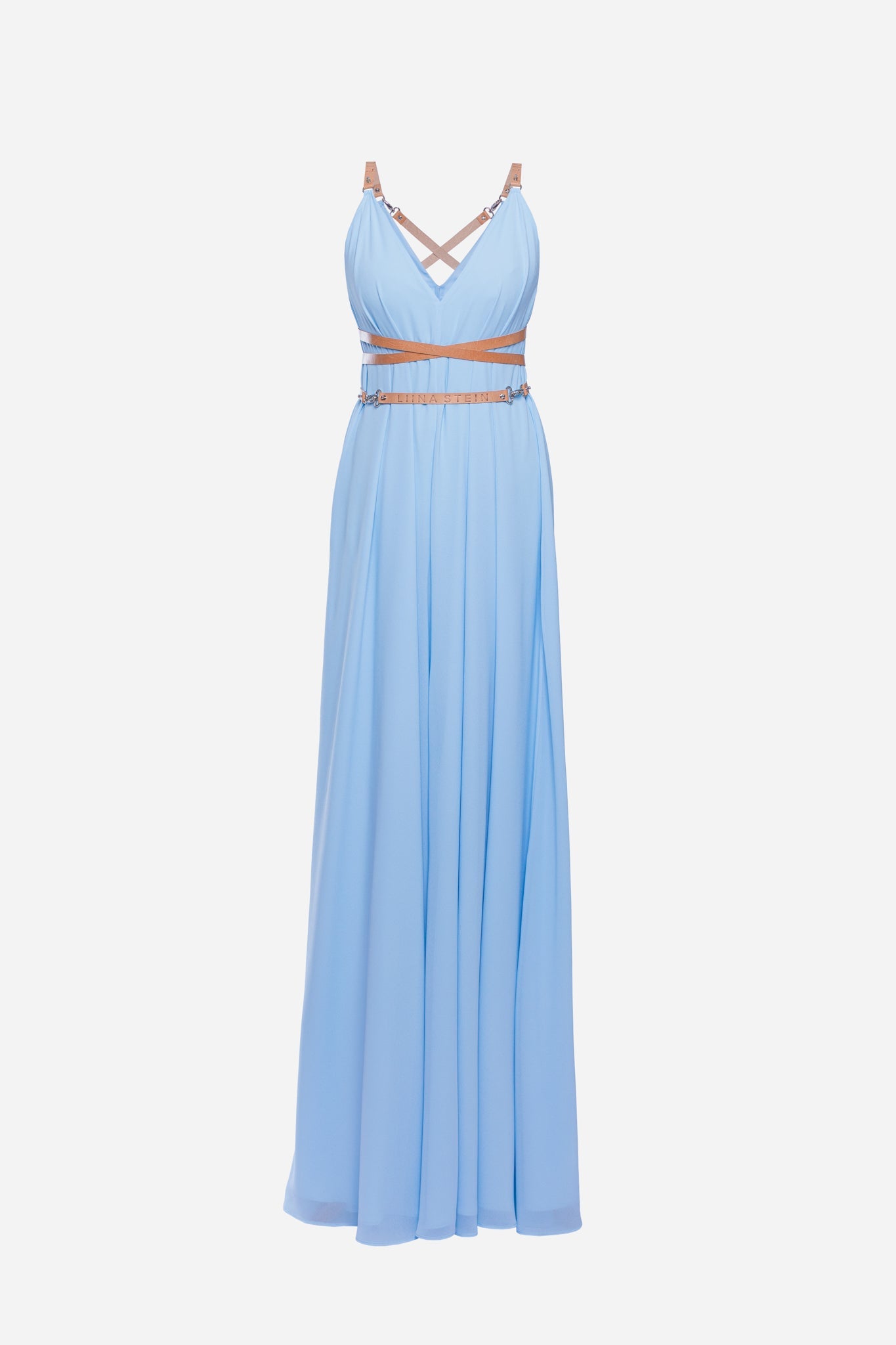 Blue crepe dress with leather straps. The straps are wrapped around the body and fastened with a silver carabiner. The dress can also be worn without the leather straps.