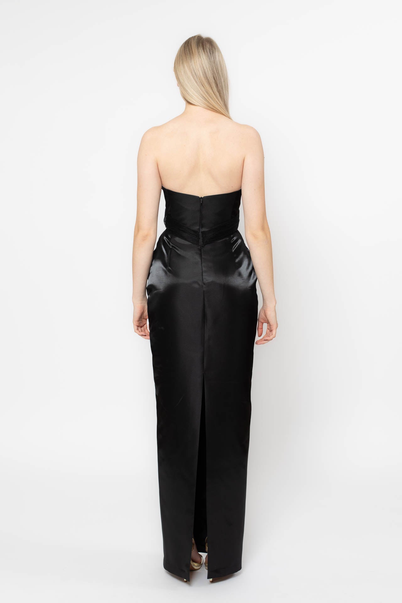 Elegant black evening dress, the top adorned with petal-shaped details that allow the wearer to shine like a captivating flower. The dress has a concealed zipper at the back.
