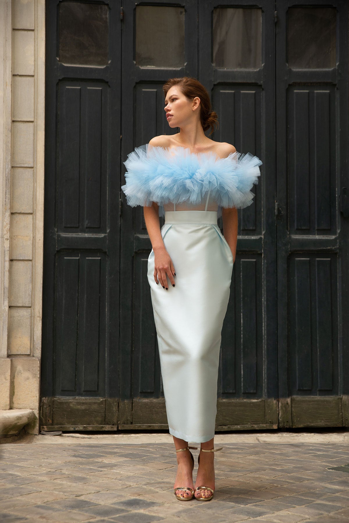 A flirtatiously fluffy bodysuit with a voluminous top, perfect for summer fun. The bodysuit pairs well with our blue pencil skirt and various items from your existing wardrobe.