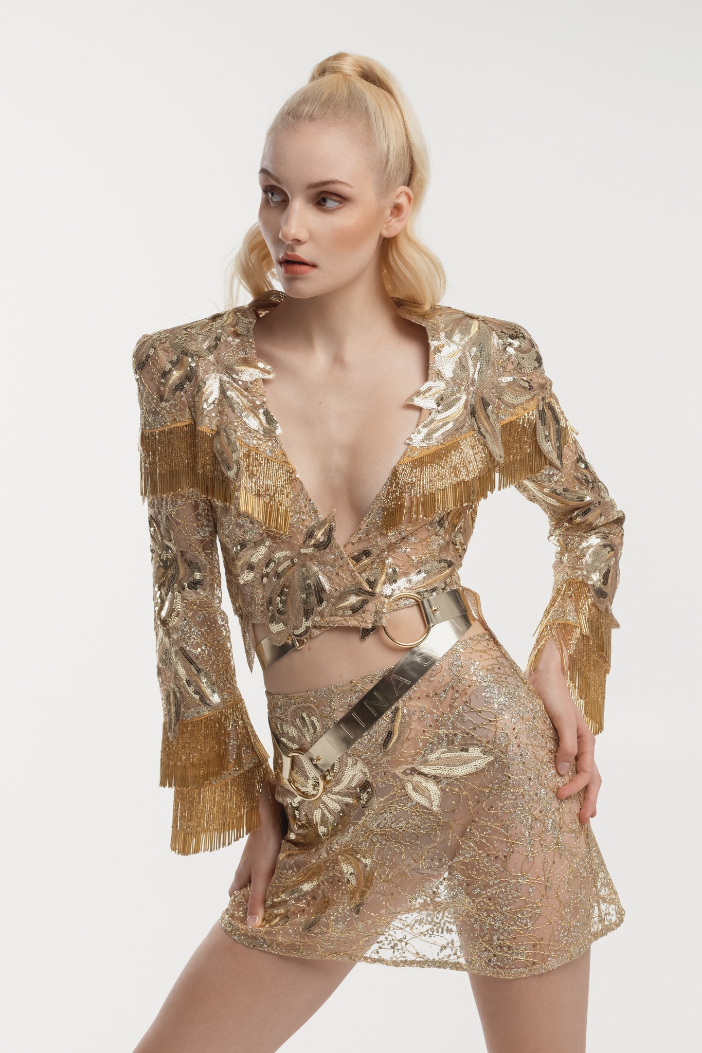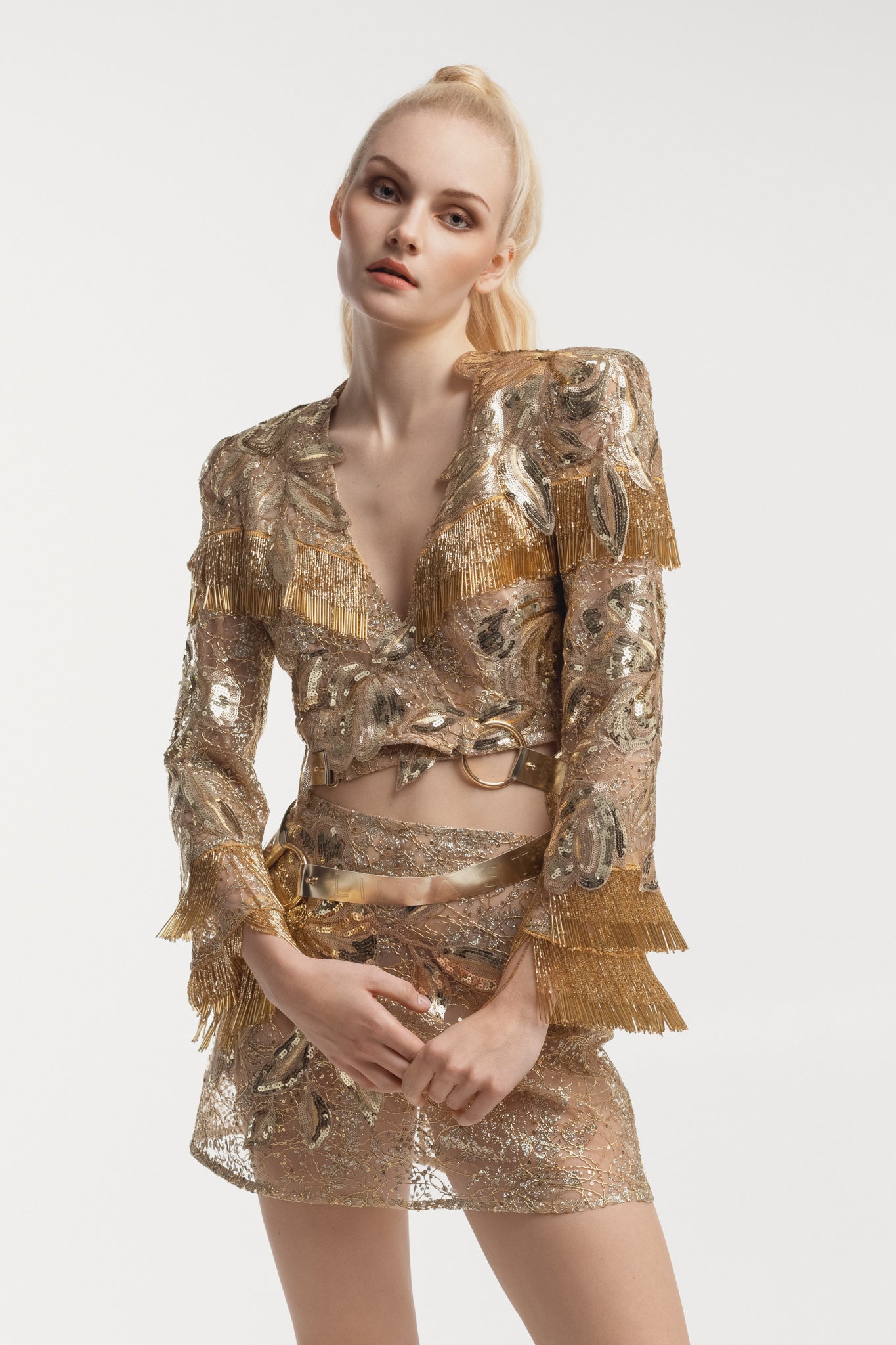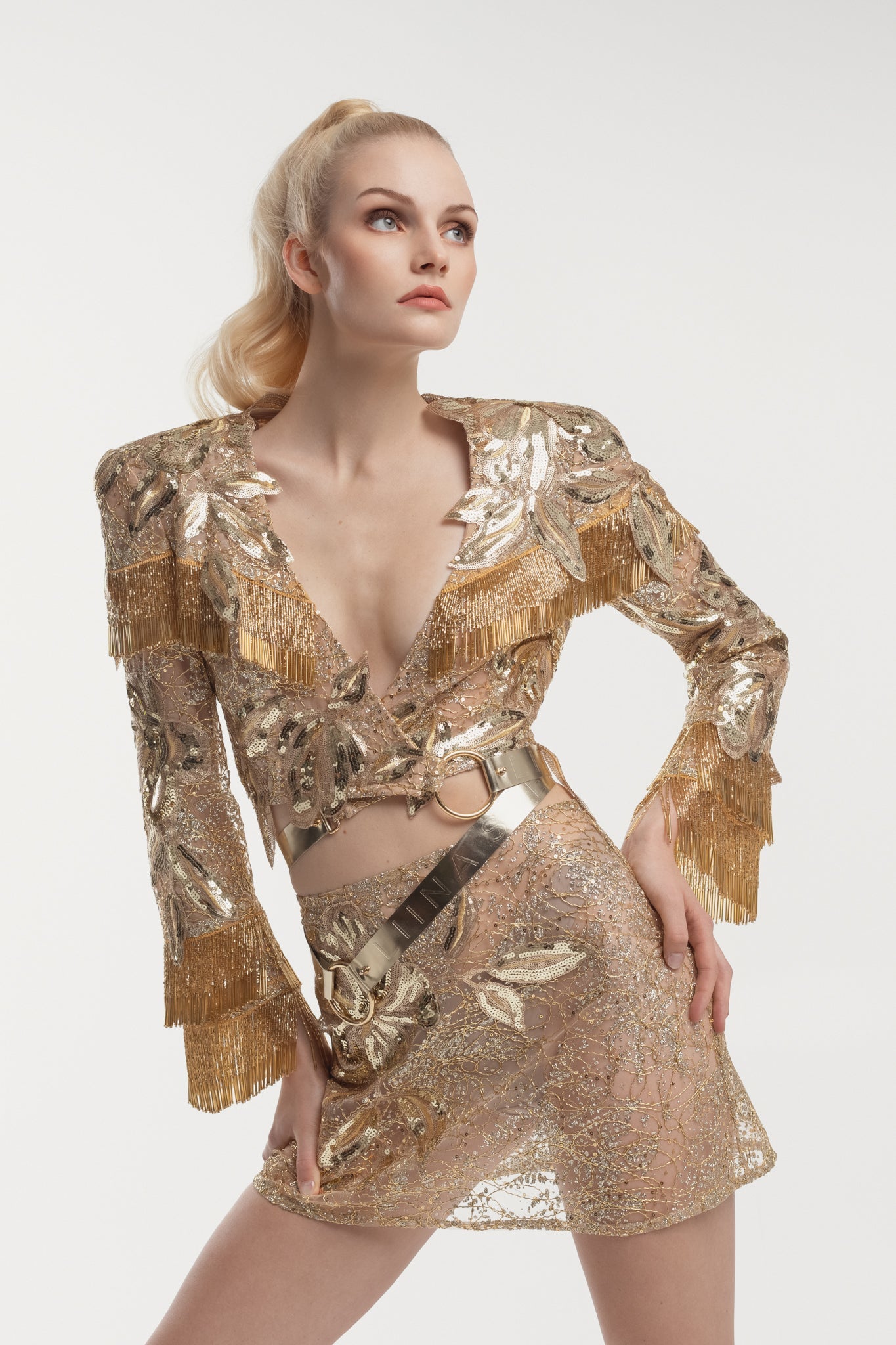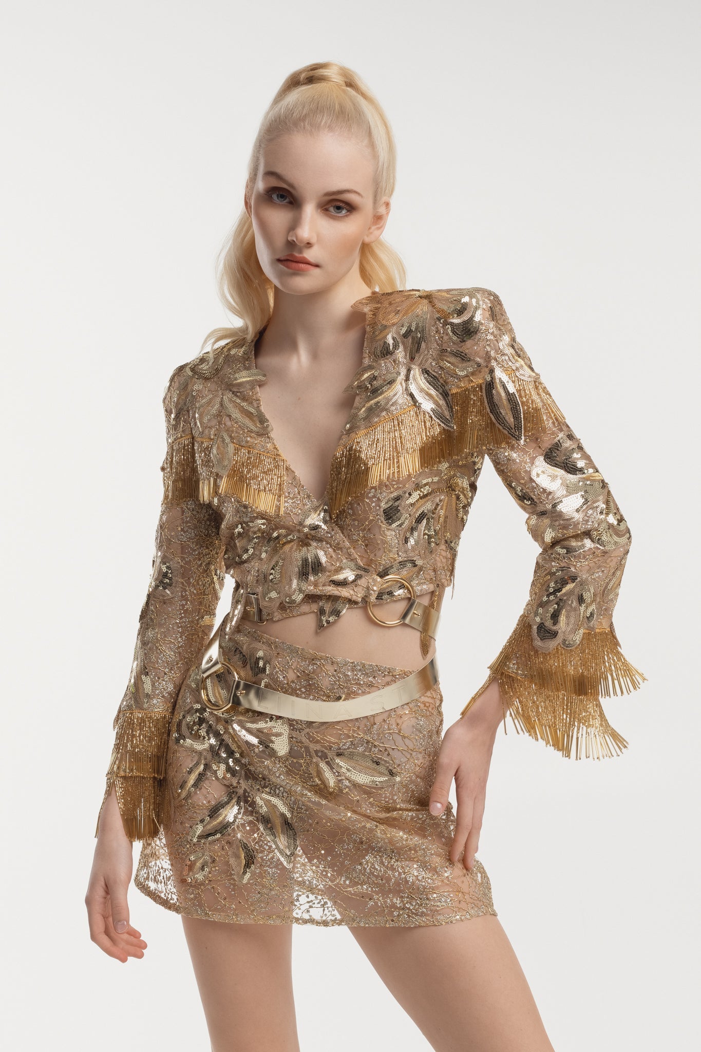 Borderline Jacket is a statement piece that exudes glamour and luxury. Featuring a combination of different laces and golden leather straps, the jacket is adorned with tassels that add movement and drama to the design.