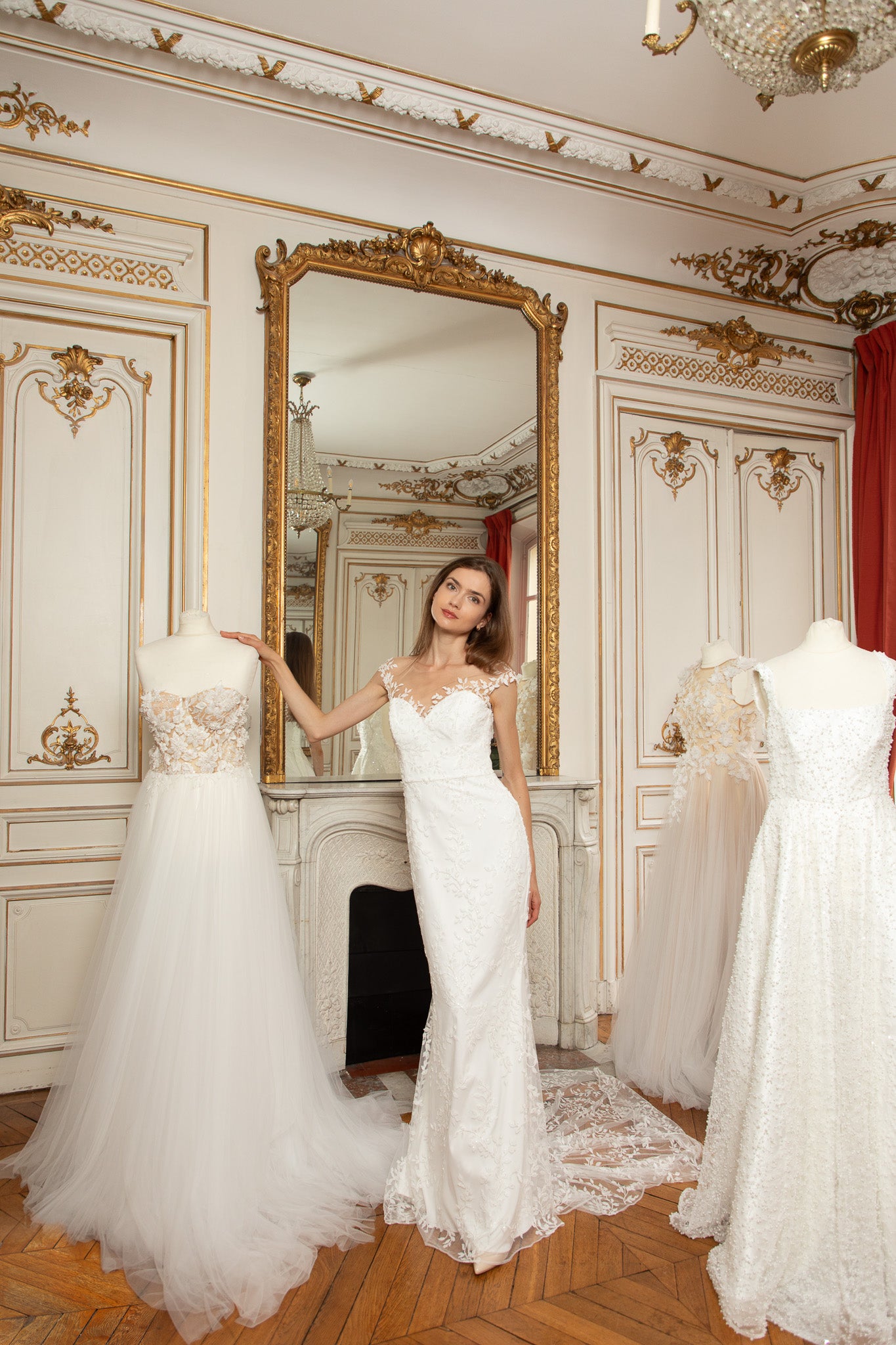 Wedding gown with a majestic train, crafted from pearl-embellished lace with romantic leaf motifs. A beautiful choice for brides seeking timeless elegance and a touch of modern glamour, perfect for making a breathtaking entrance and amazing wedding photos.