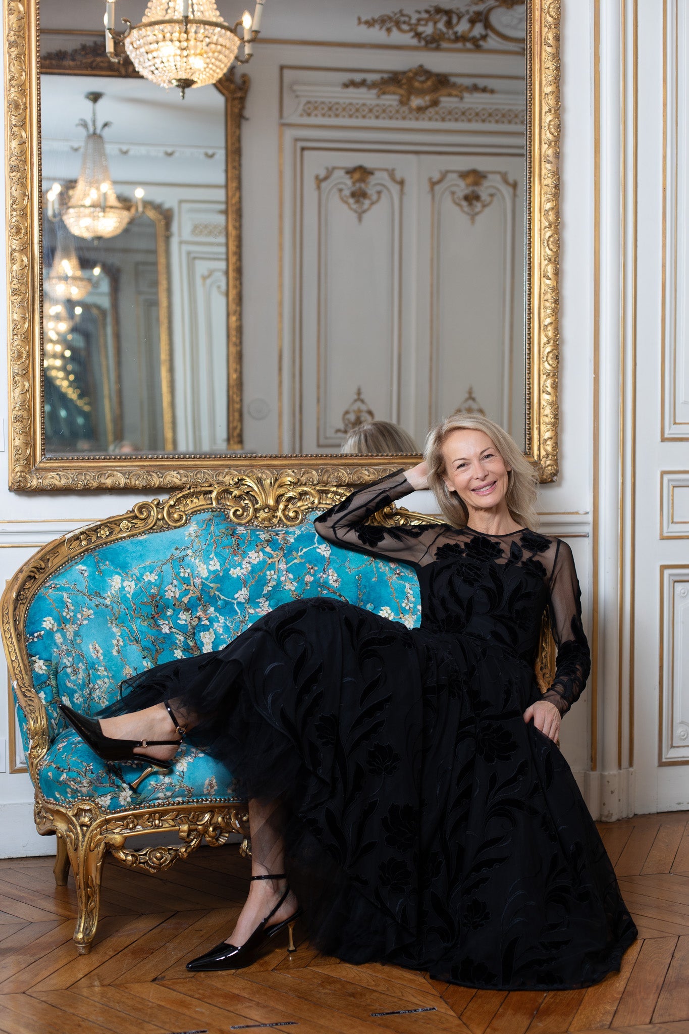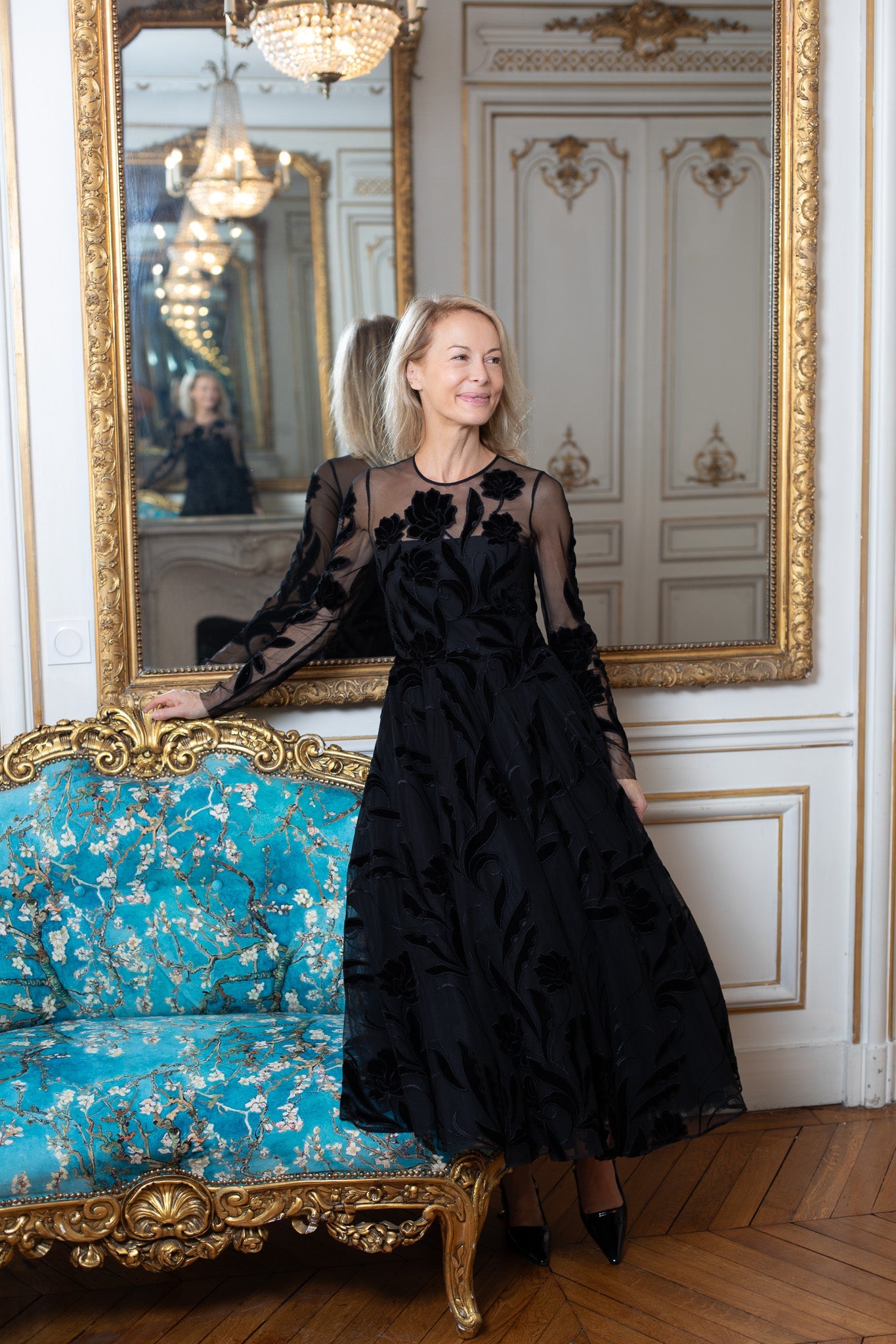 Must sametiste lillemotiividega peokleit, millel on kohev, midipikkuses seelik. Stiilne ja ajatu kleit jõulu- ja aastalõpupidudeks.