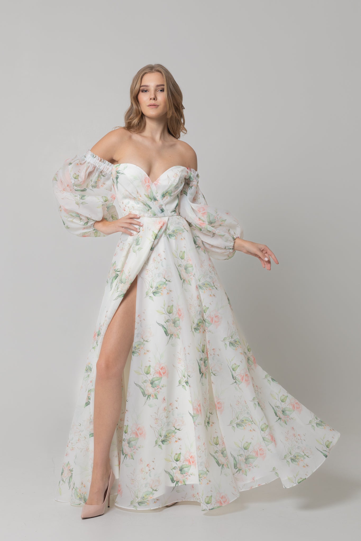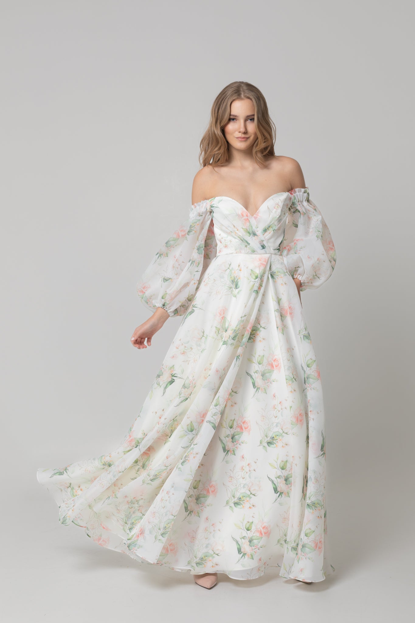 An off-shoulder boho-style gown crafted from floral organza, designed with a structured corset bodice for a flattering silhouette. The airy fabric flows gracefully, while the voluminous, fluffy sleeves add a touch of romance and whimsy. Perfect for a free-spirited bride seeking an effortlessly elegant look.
