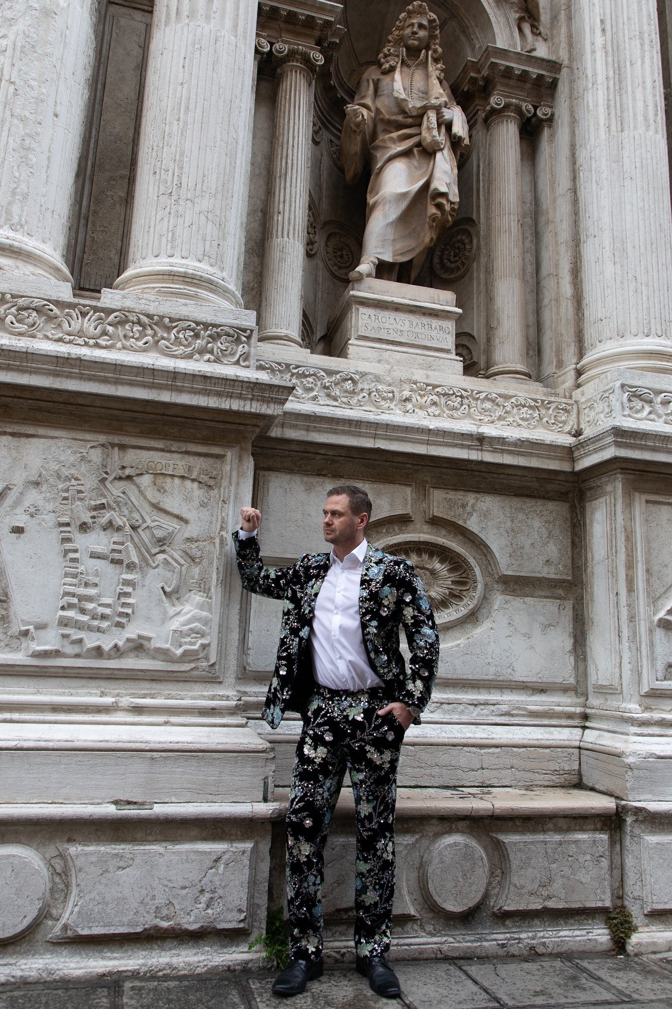 Velvet trousers with blue-green floral motifs that match perfectly with the blazer made from the same fabric.