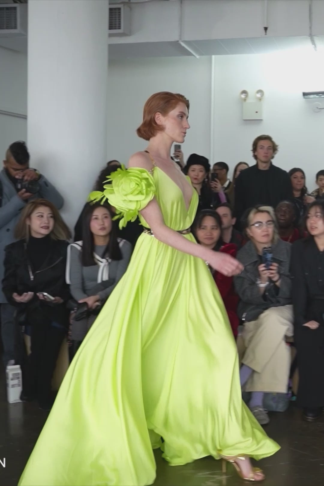 The Green Walking Flower Dress features a long, green silhouette enhanced by golden leather straps that wrap around the waist and fasten with a golden carabiner. Handcrafted green flowers with feathers around the arms are attached to the golden leather straps and can be removed if you would also like to wear the dress without them.