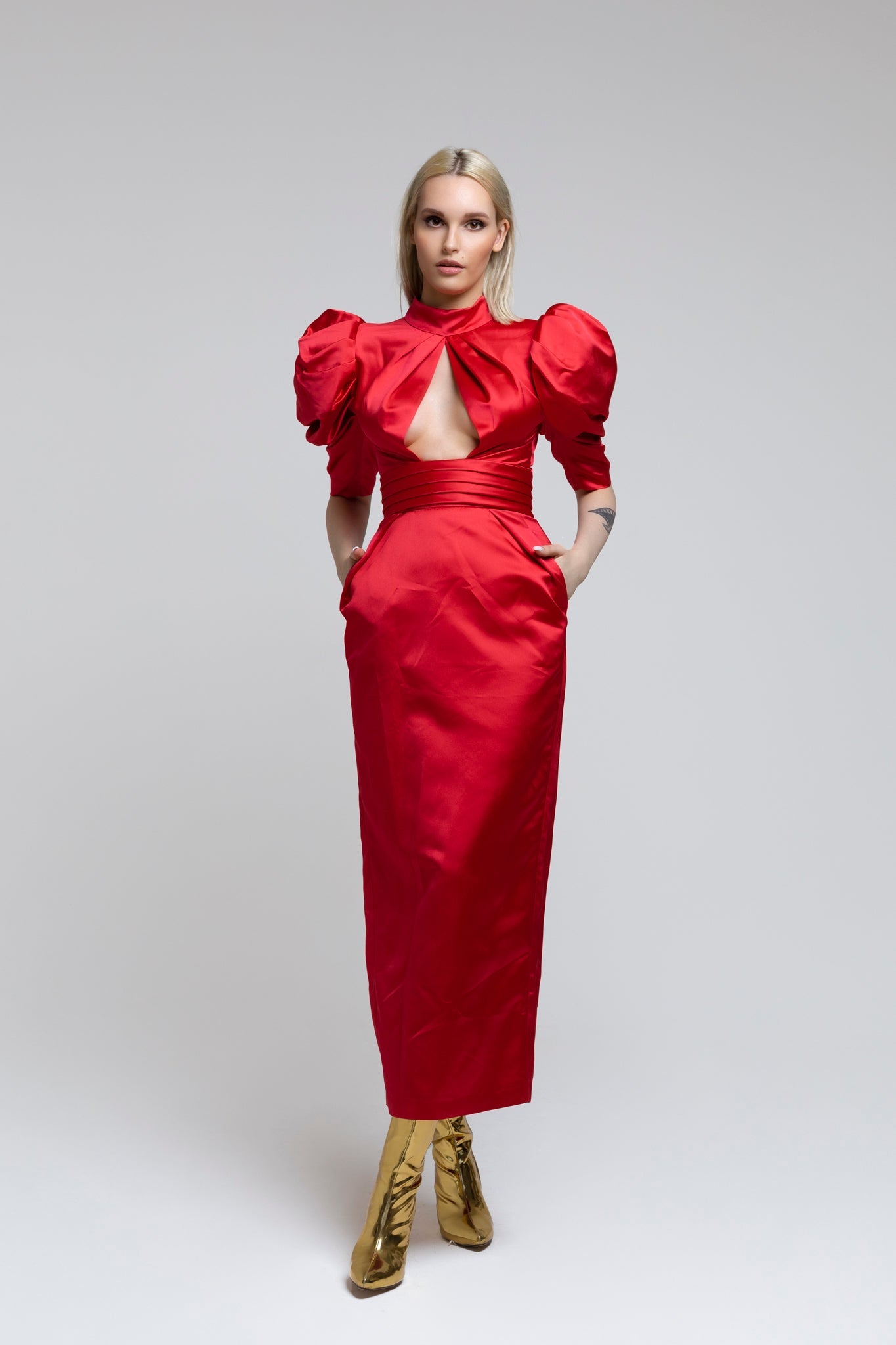 Make a statement with the "Homard Rouge" dress. Inspired by French cuisine, this red ensemble boasts a sheath silhouette and puffy sleeves, merging timeless grace with a modern midi length. A chic ode to fashion's enduring allure.