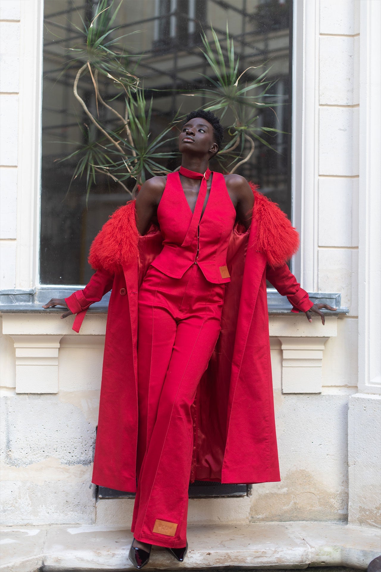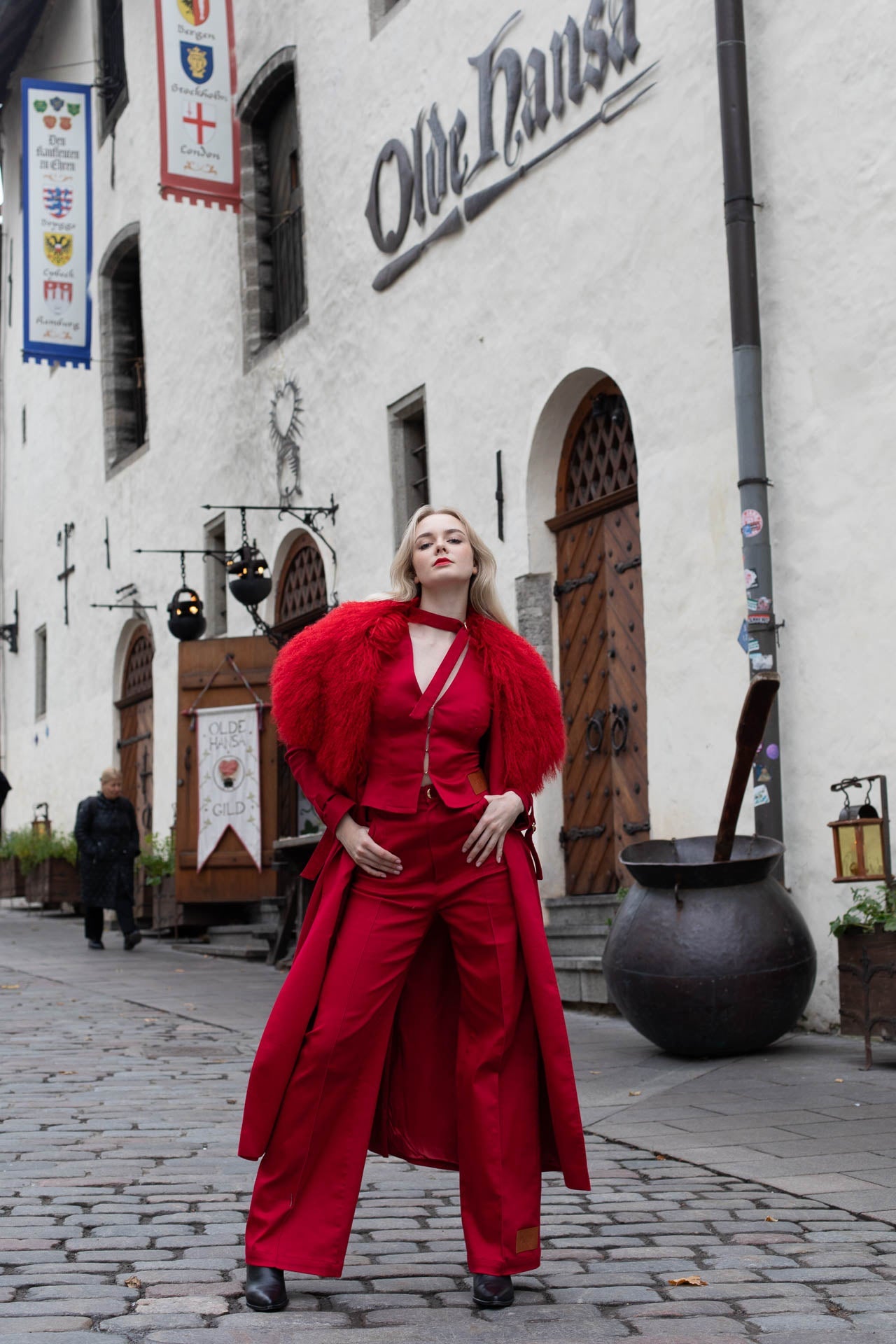 Stylish red denim trench coat with a collar decoration. This coat is one-size-fits-all, suitable for wearers size 34-40. The collar decoration is easily removable, allowing the coat to be worn without it. The coat has a viscose lining.