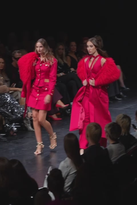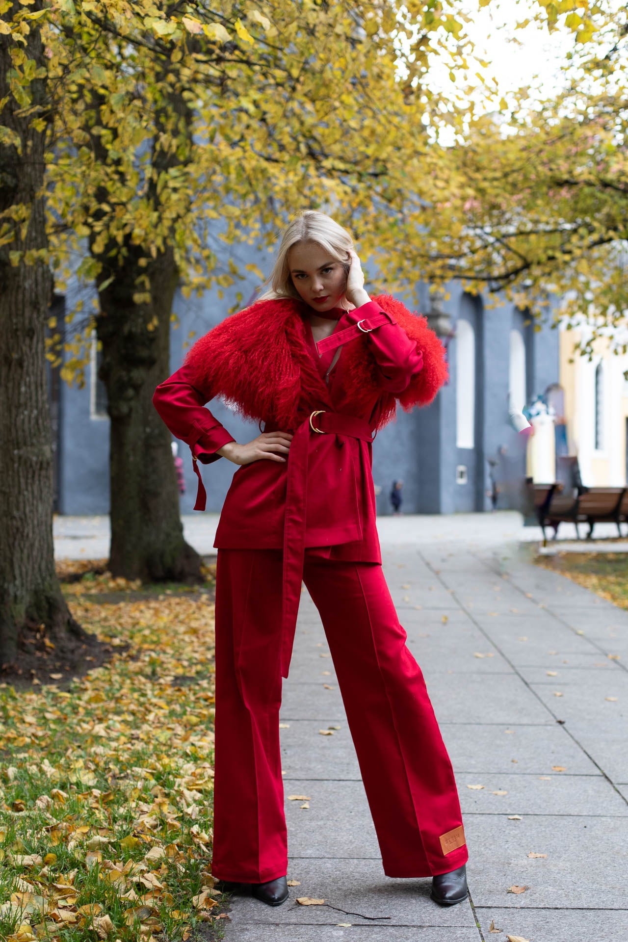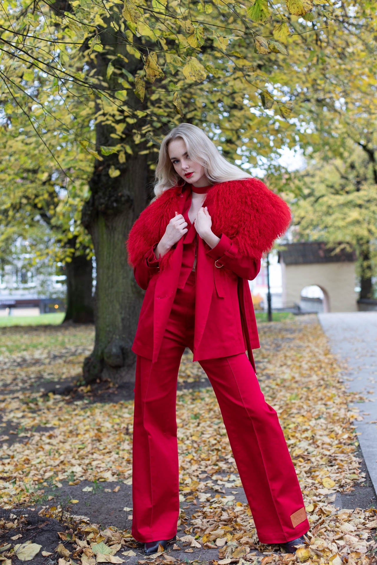 Vibrant red denim trench jacket from the "I Love Your Coat" collection. The jacket features a viscose lining and a removable collar decoration. It is suitable for pairing with various everyday clothes, as well as with red pants, a vest, and a blouse made of the same fabric from our denim collection.