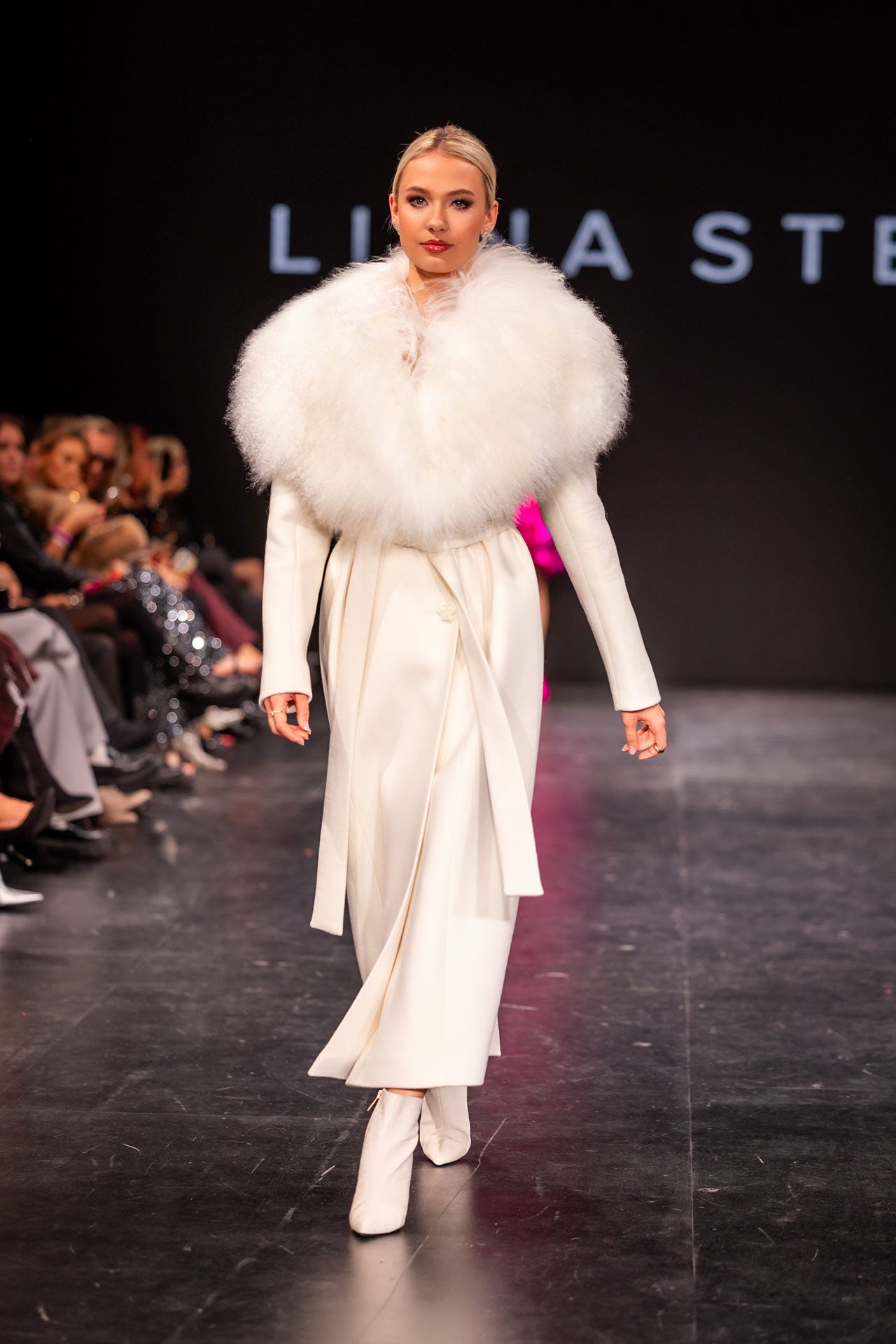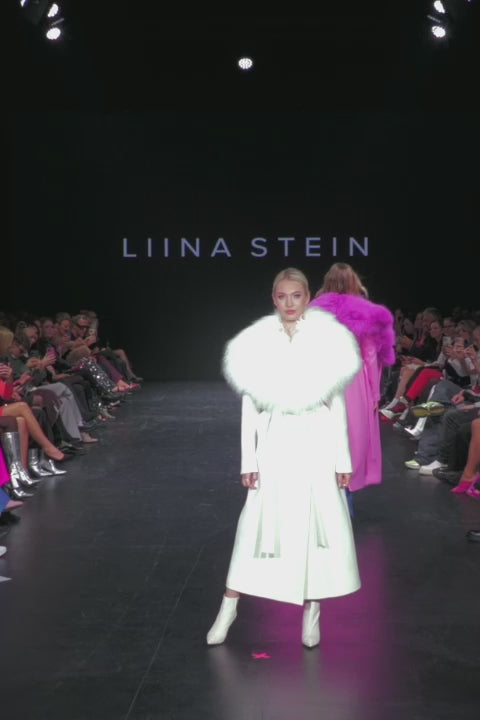 Warm and stylish white cashmere coat with a collar embellishment. The collar embellishment is easily removable, and the coat can also be worn without it. The coat features a tie-up wool belt.