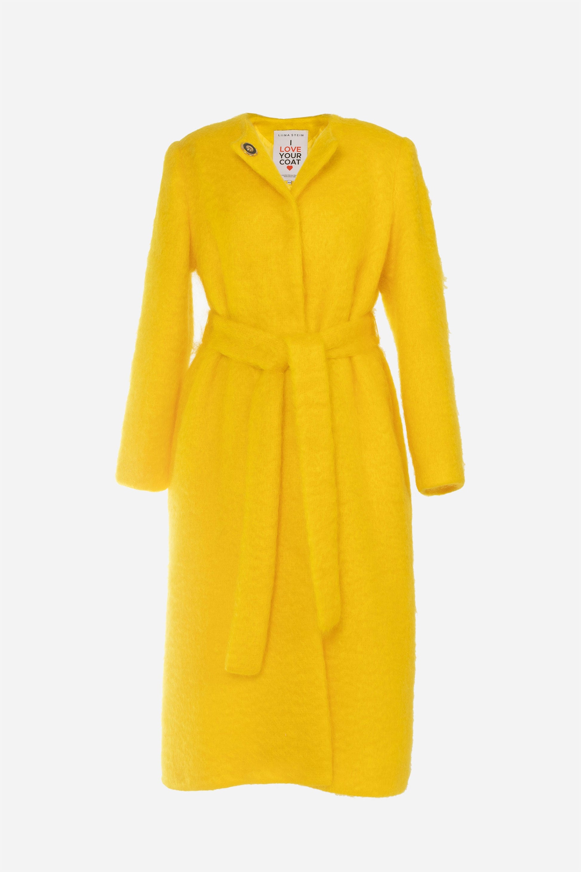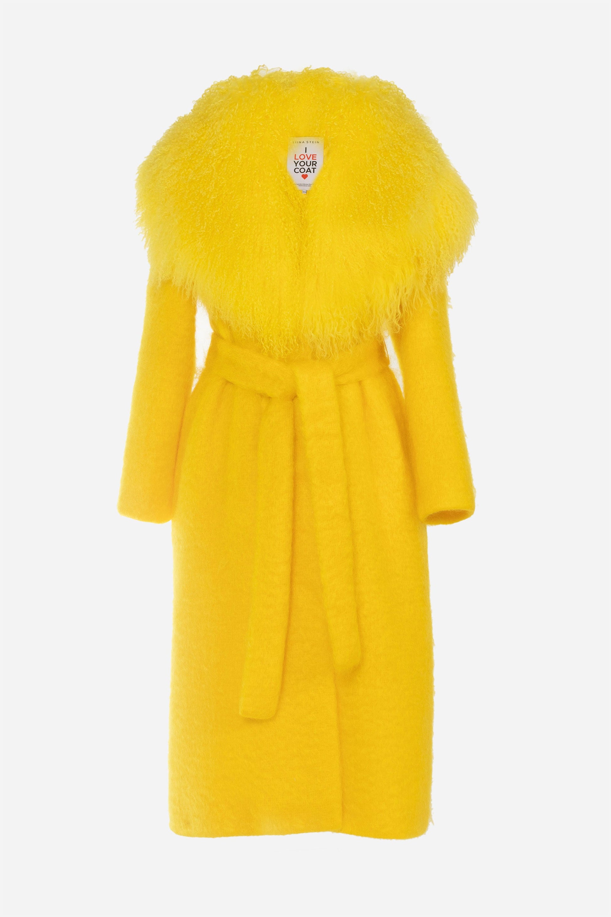 Soft and stylish yellow mohair coat with a Mongolian sheep fur collar. The coat is one-size-fits-all and suitable for wearers of sizes 34-40. The fur collar is easily removable, and the coat can also be worn without it.