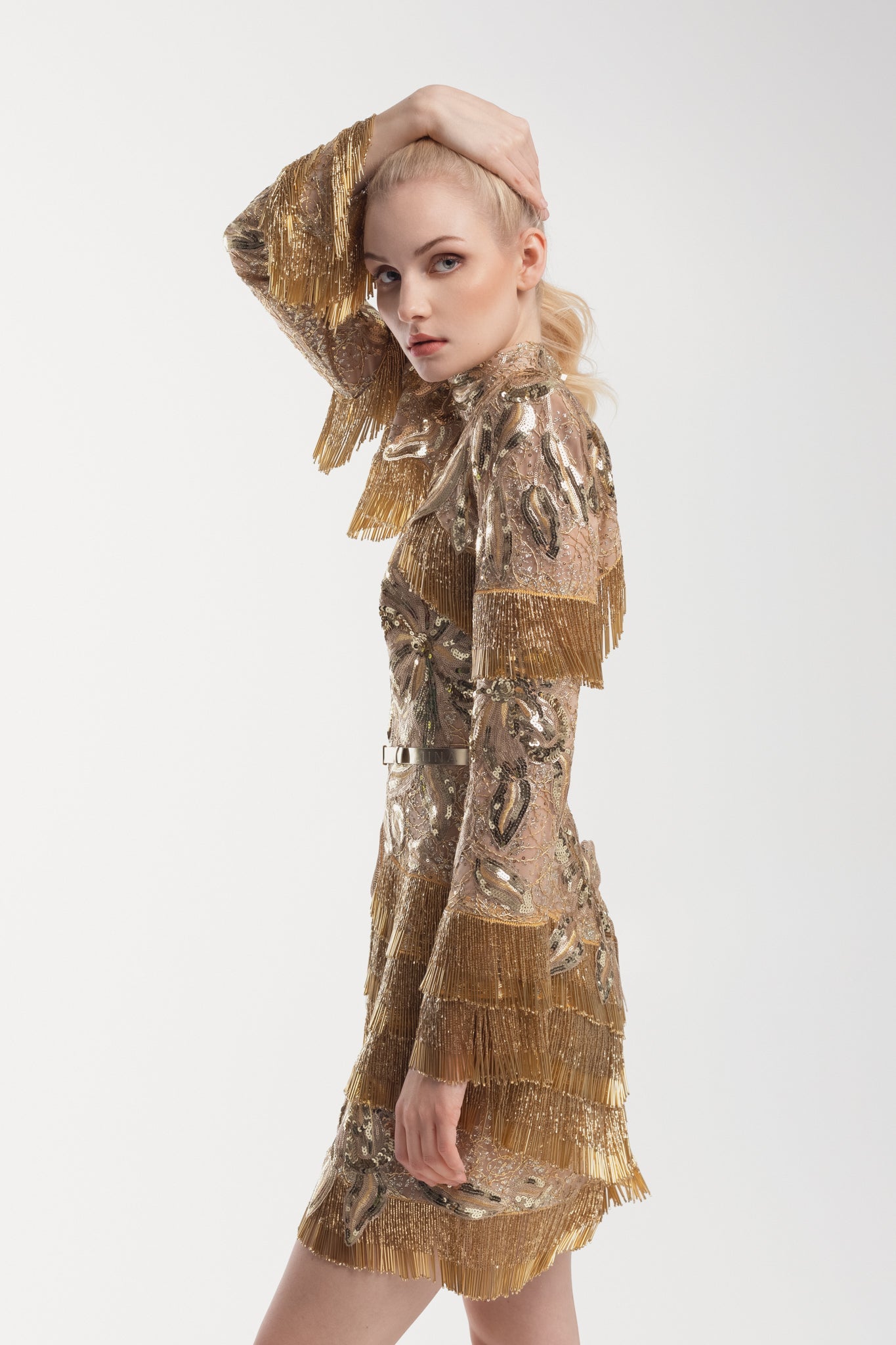 Transform your dreams into reality with our golden cocktail dress, inspired by Madonna's 'Just a Dream.' This exquisite design showcases a blend of distinct laces and pearl-embellished tassels. The golden leather straps, elegantly wrapped around the waist, inject a dose of glamour, while the open back introduces an alluring touch. This dress is the perfect statement piece for any special occasion.