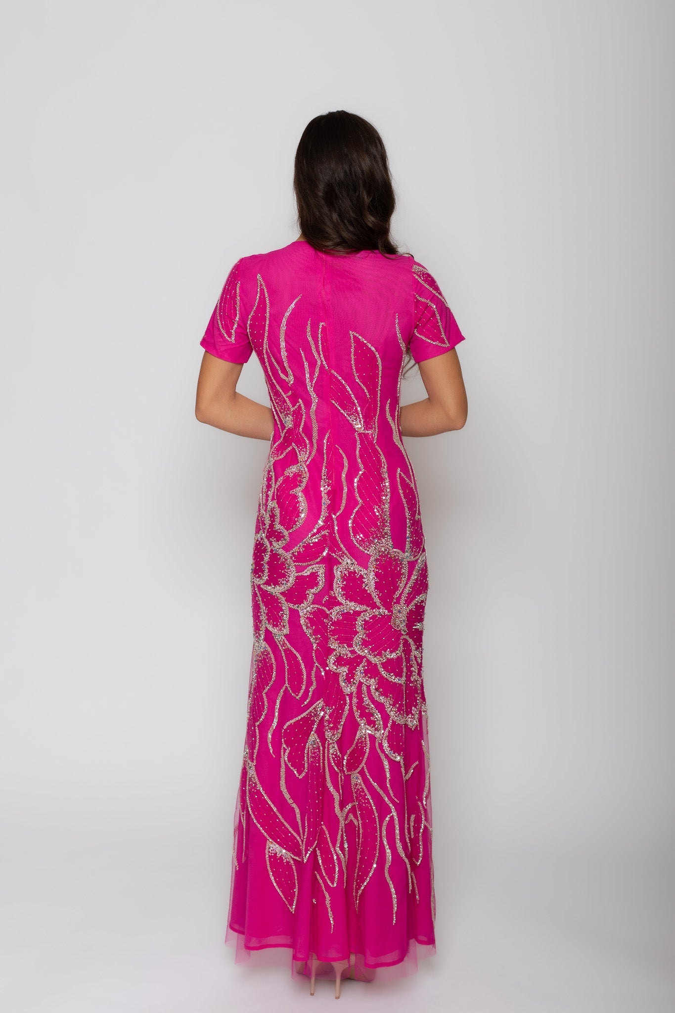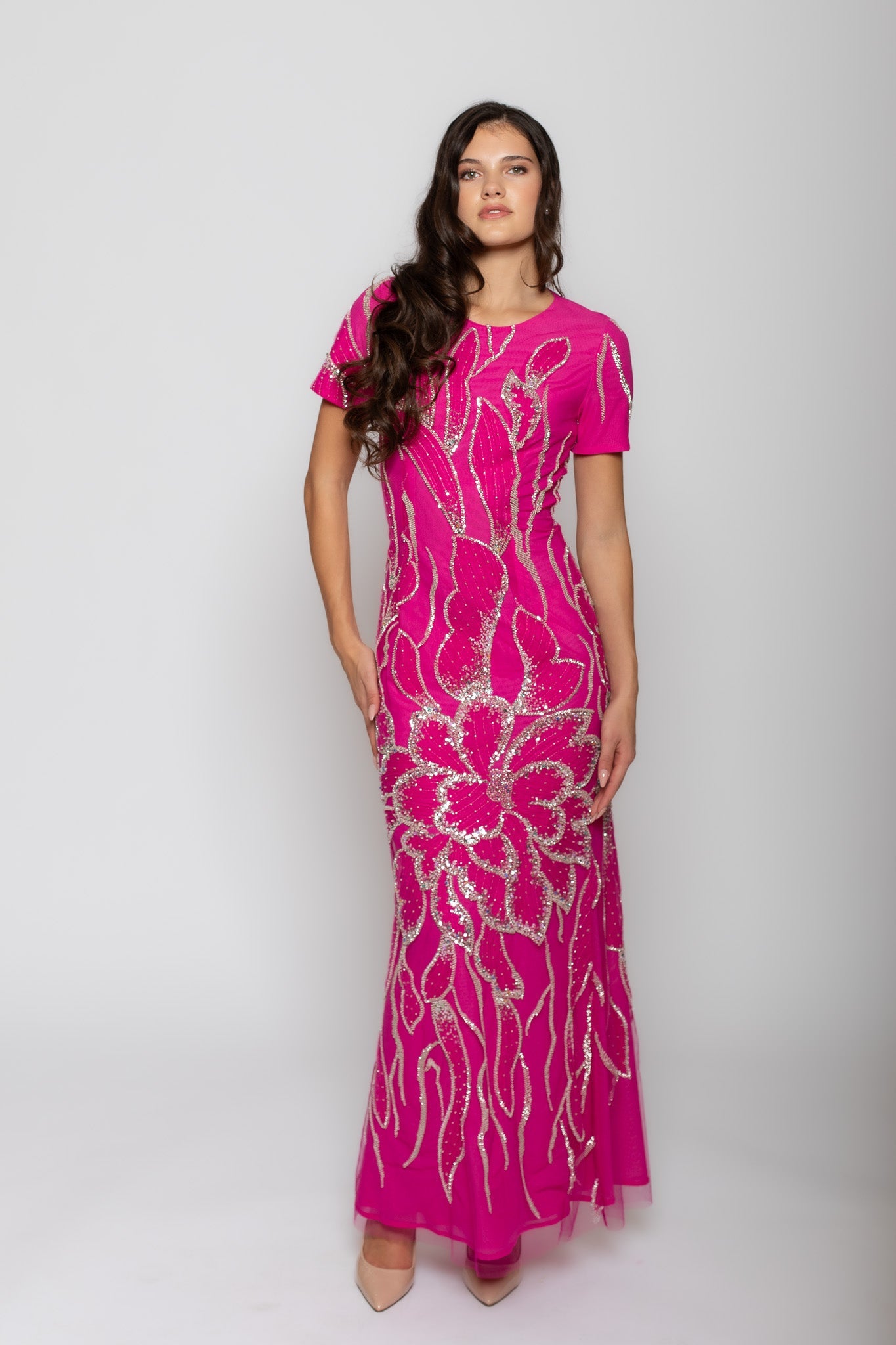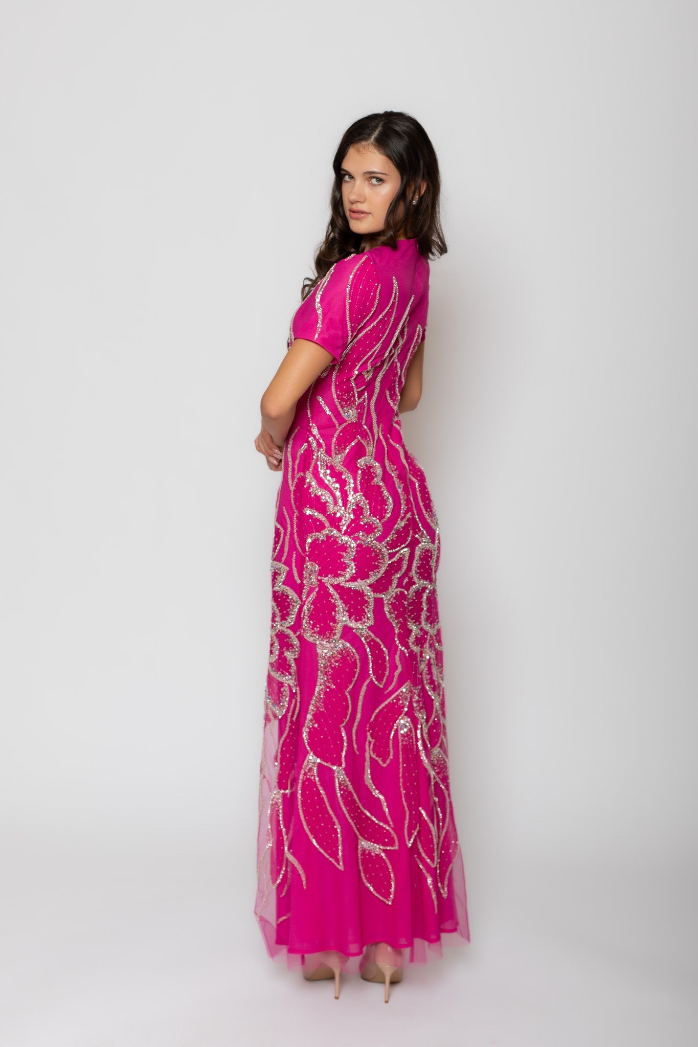 Pink evening dress adorned with silver sparkling floral motifs and small sleeves. The dress features a comfortable nylon mesh lining and an invisible back zipper.