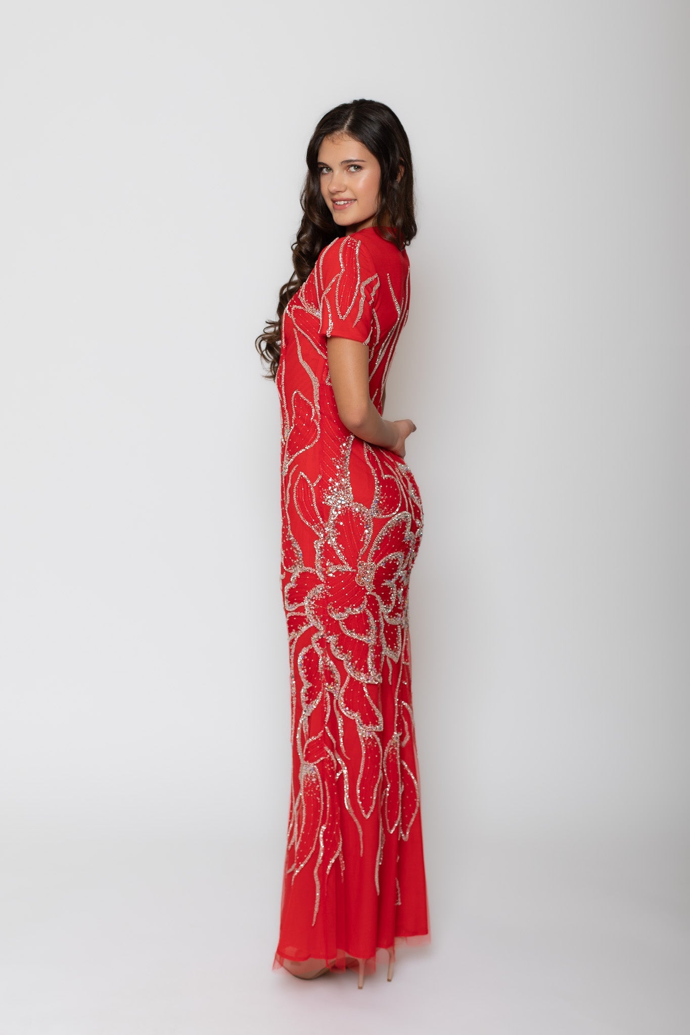 Red evening dress adorned with silver sparkling floral motifs and small sleeves. The dress features a comfortable nylon mesh lining and an invisible back zipper.