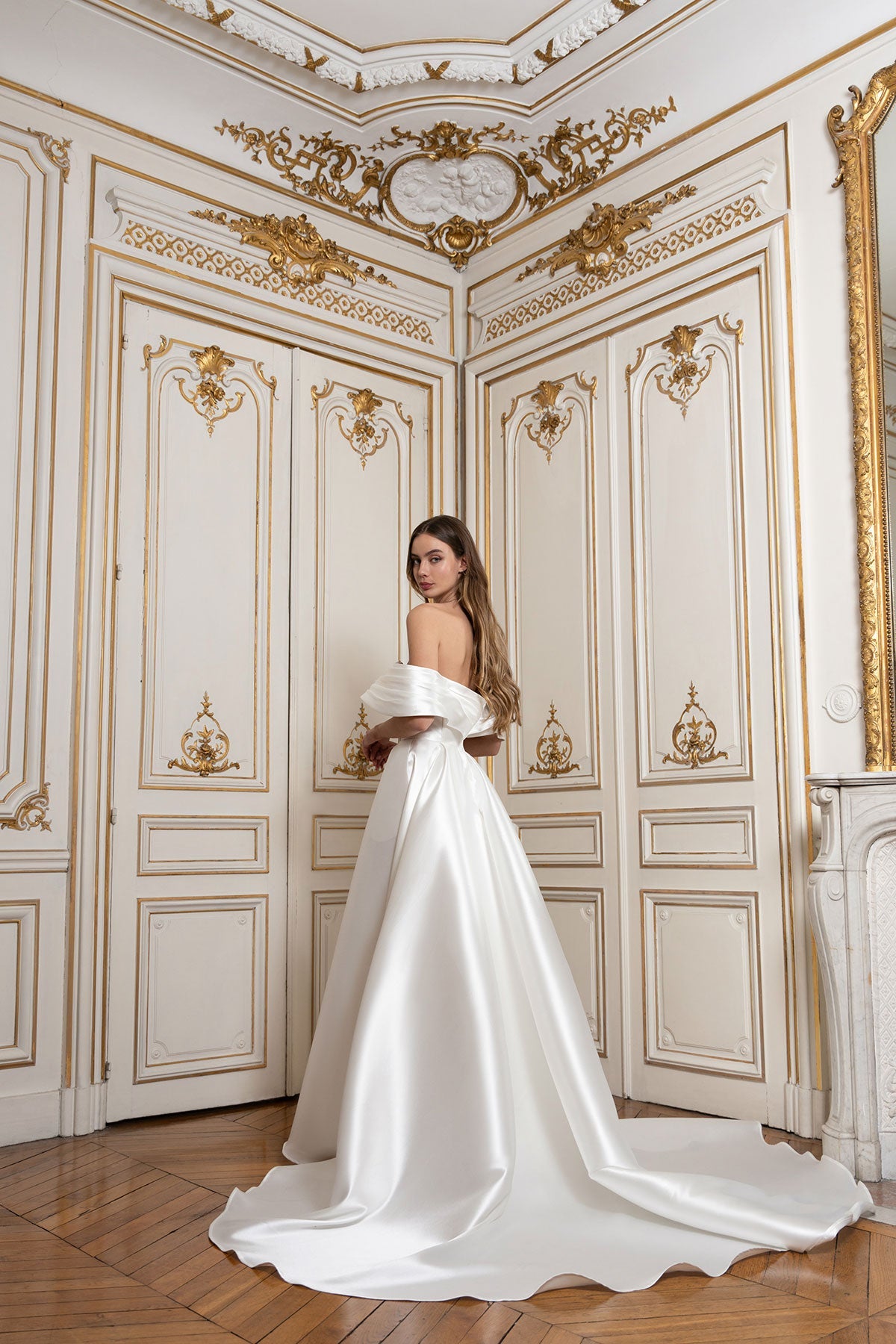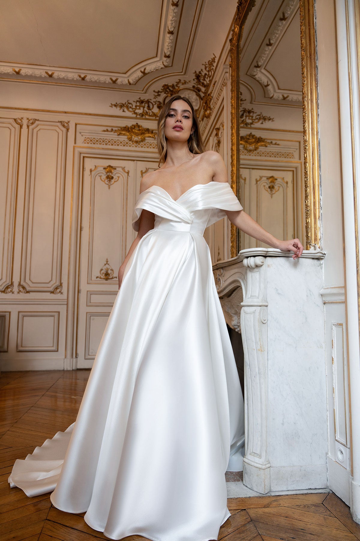 Elegant satin bridal gown featuring a voluminous skirt and sweeping train. The off-the-shoulder neckline adds a romantic touch, while a concealed back zipper ensures a seamless fit.