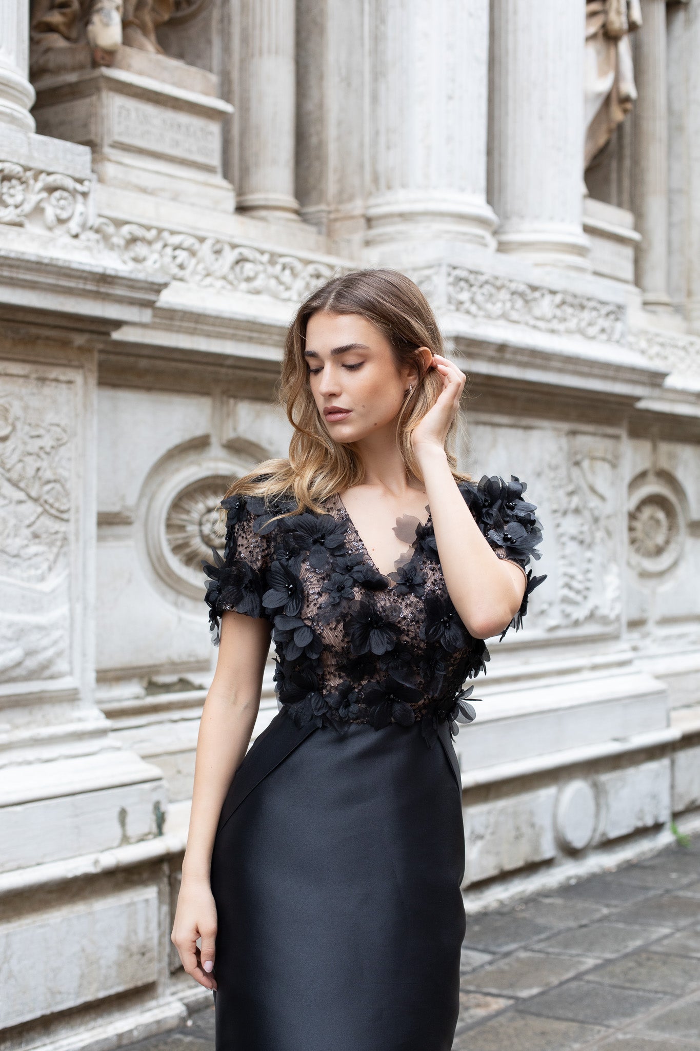 Elegant mid-length black party dress with a floral lace top. The dress features pockets and a concealed back zipper.