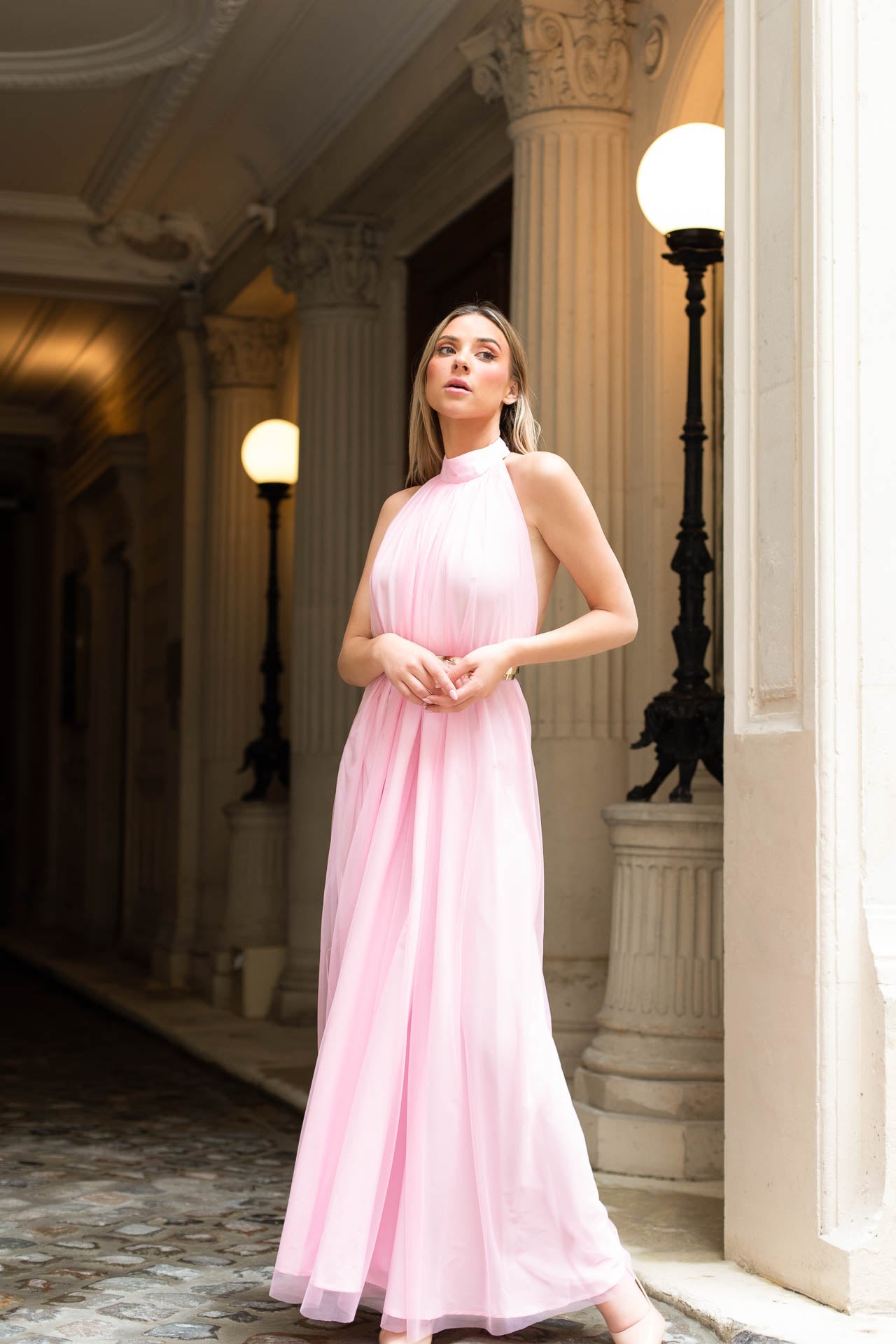 Pink open-back tulle dress perfect for graduations, weddings, and other summer celebrations. The dress fits sizes 34–40 and can be adjusted at the waist with a belt. The gold leather belt shown in the photo is included with the dress.
