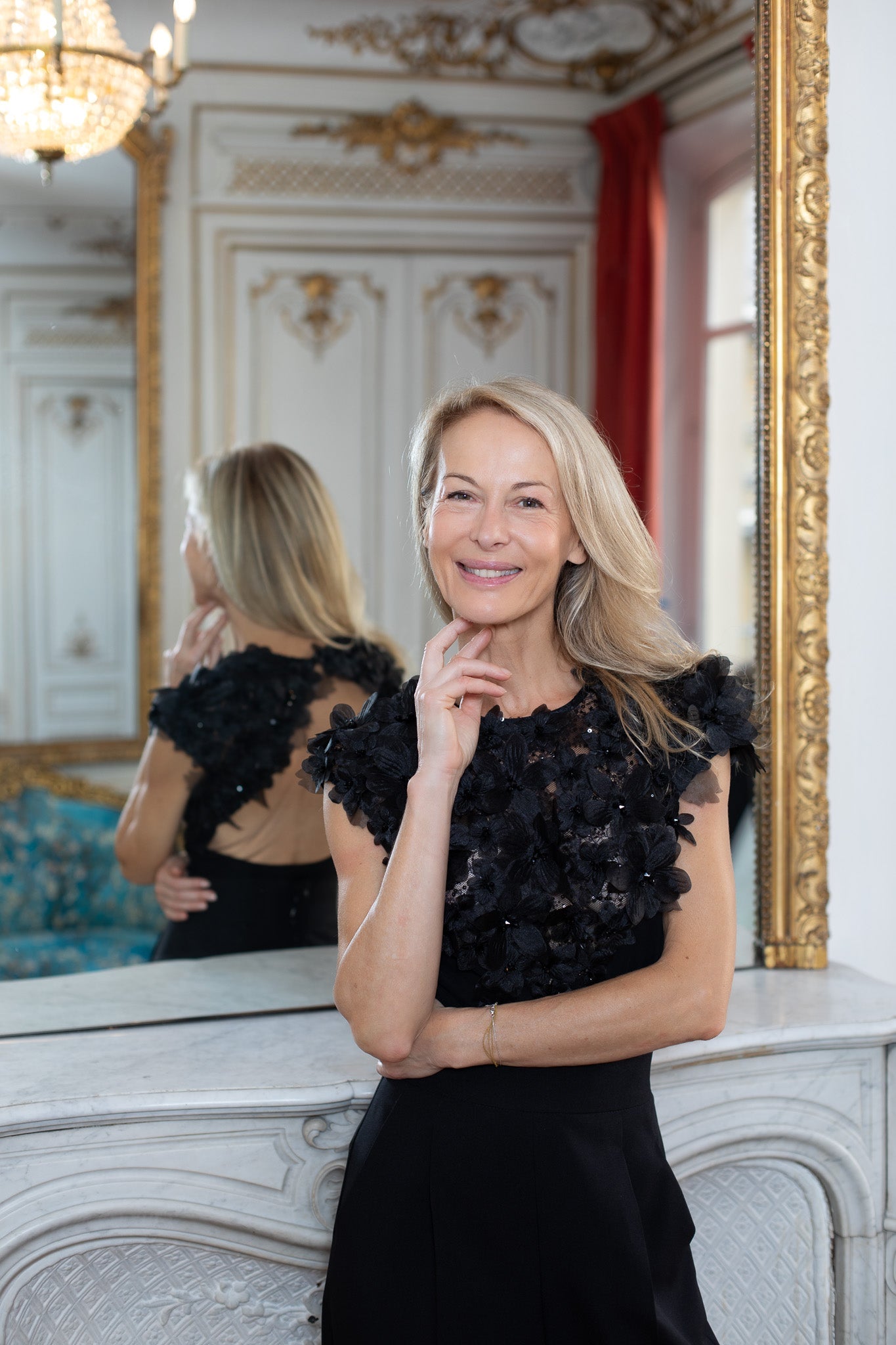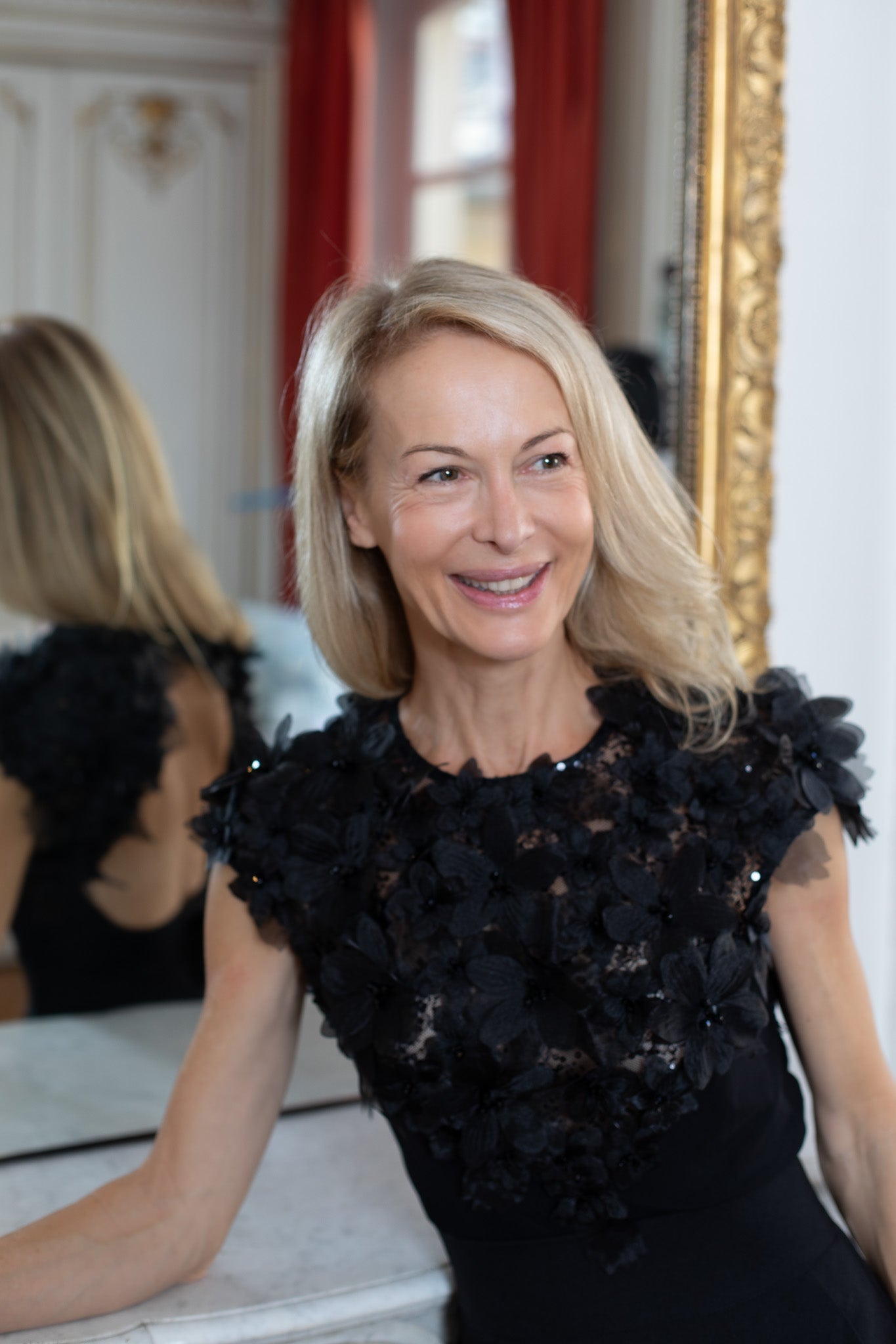 A black bodysuit with small sleeves, decorated with tiny flowers and pearls. The bodysuit features an open back, is made of stretchy fabric, and is comfortable to wear. Style it with trousers or a skirt – the black trousers shown in the picture are available in our collection.