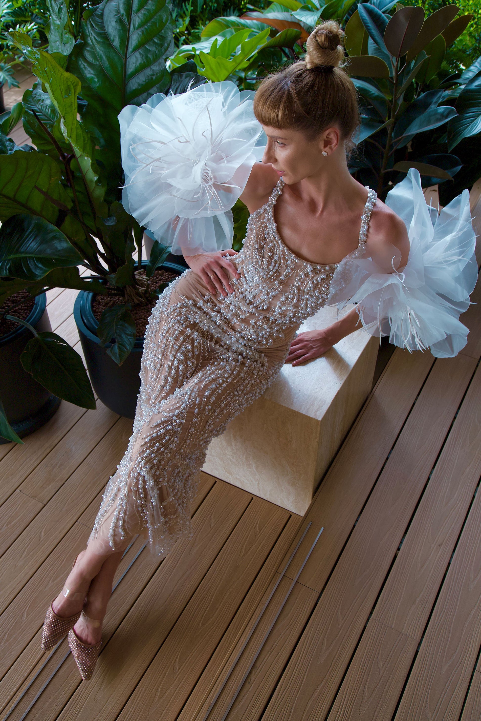 Floral sleeves adorned with organza flowers and feathers, designed to be worn on the arms. They pair beautifully with our Pearl Collection gowns as well as other garments.