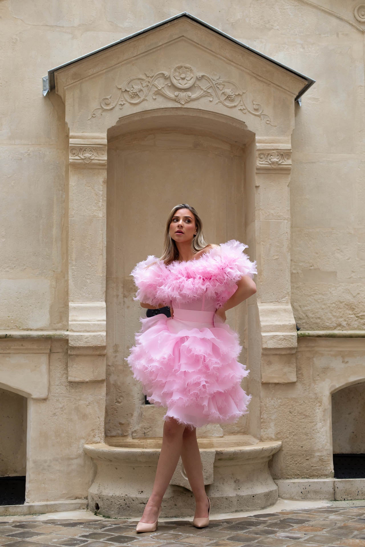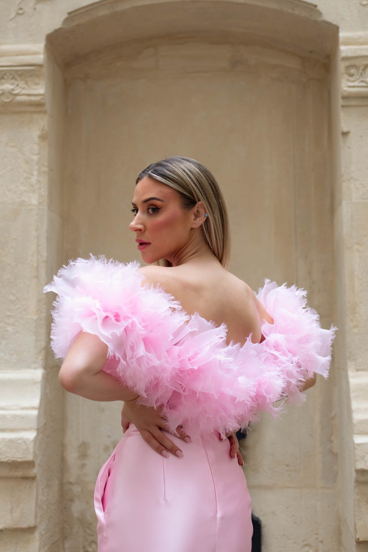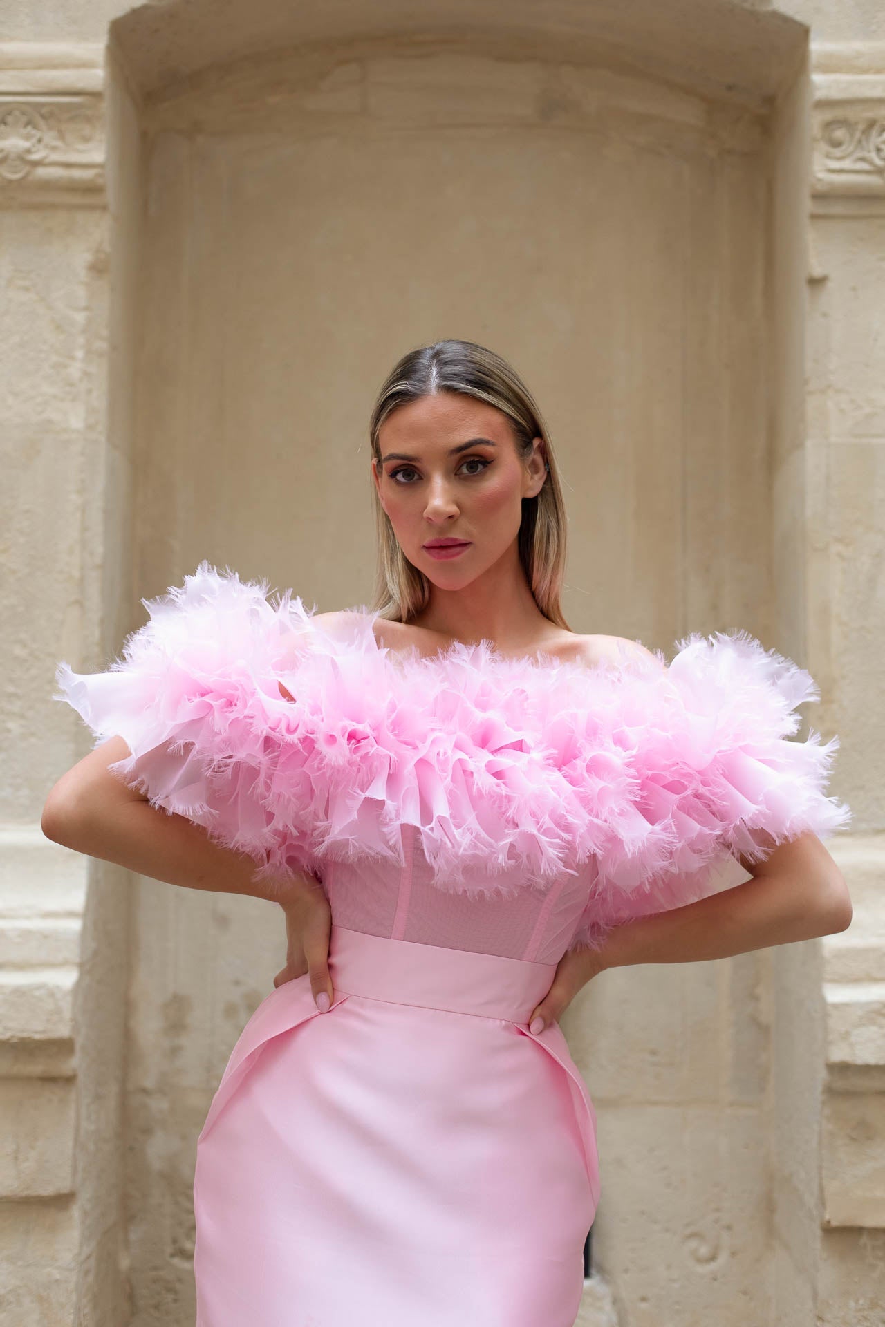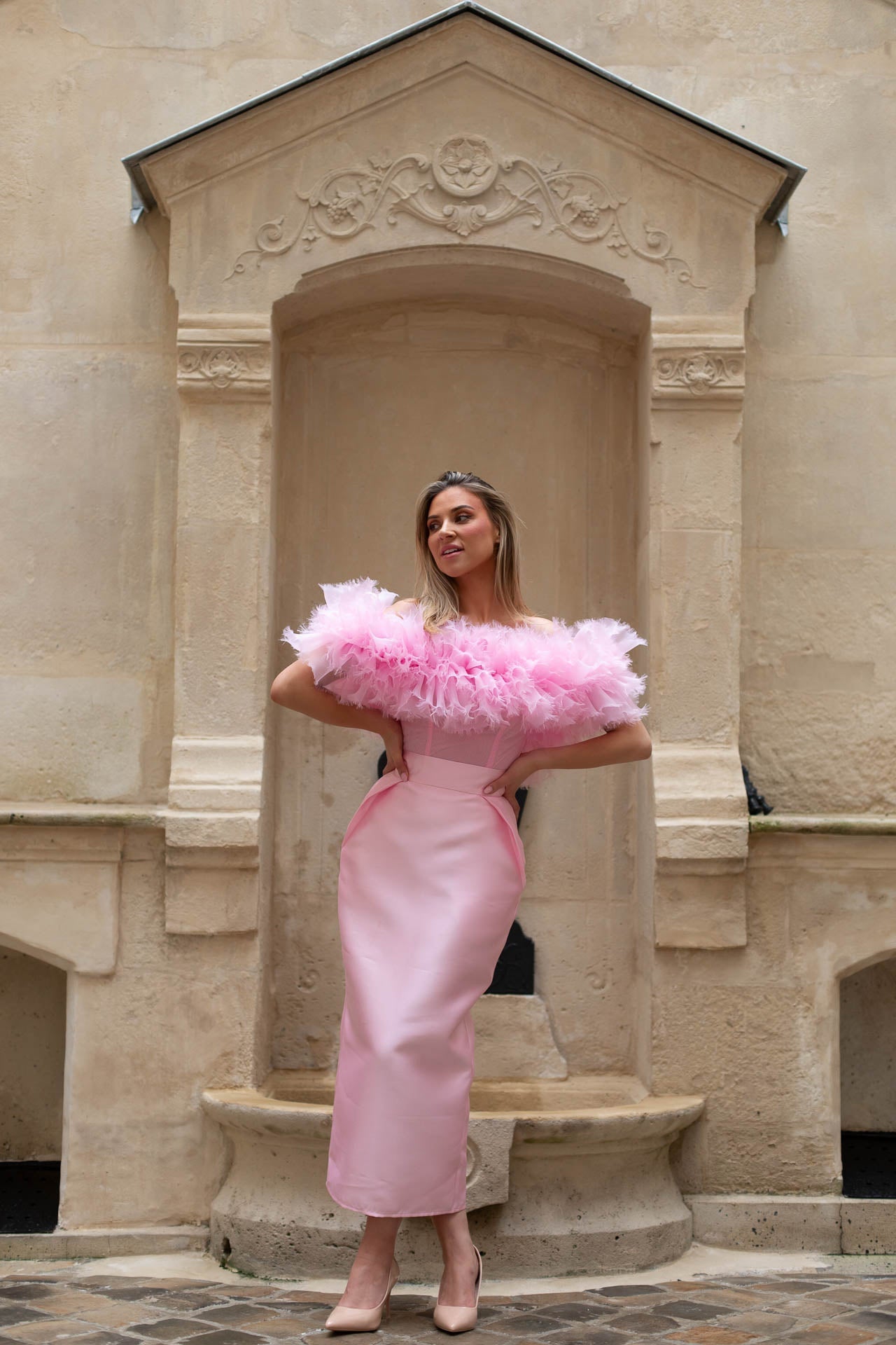 Pink ruffled organza bodysuit with bold structure, designed to be paired with the matching ruffled skirt from our collection, the simple pink midi pencil skirt, or the pink pants. It also styles beautifully with other trousers and skirts from your existing wardrobe.