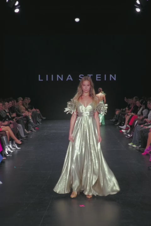 Golden long dress with a festive sheen and leather straps, adorned with handmade flower appliqués. The flowers are easily removable, allowing you to wear the dress with or without them. The dress is one-size-fits-all and suitable for wearers of sizes 34-40.
